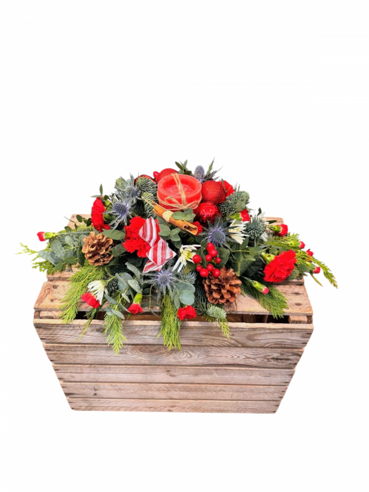 A Glowing Christmas Centrepiece, created with foliage and flowers to light up your Christmas Table. A stunning centrepiece perfect as a gift or for your own home.The images shown are examples of real arrangements recently made by us. While exact flower varieties or colours may vary depending on what's freshest and in season, your florist guarantees a beautiful, bespoke creation your recipient will love.